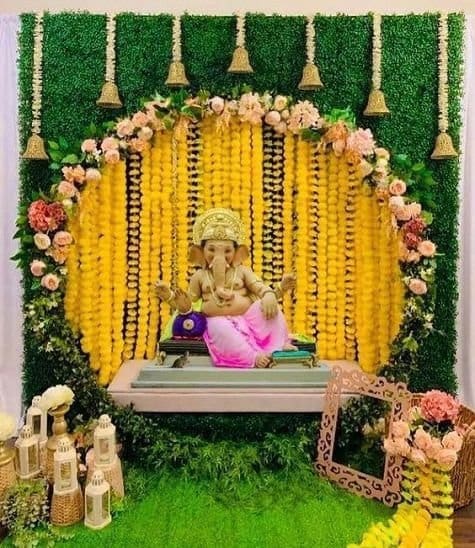 Make your Ganesh Chaturthi celebration even more memorable with our stunning artificial flowers and grass decoration. Adorned with vibrant flowers and a gorgeous Ganpati idol, this beautiful decoration adds a touch of spirituality to your home. Durable and easy to maintain, it enhances the festive ambiance, allowing you to focus on celebrating with your loved ones. Create memorable moments with this Ganesh Chaturthi decoration!